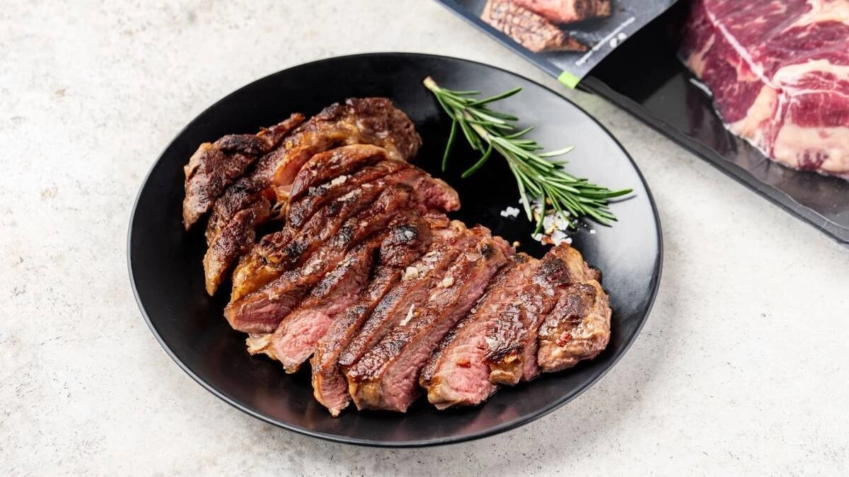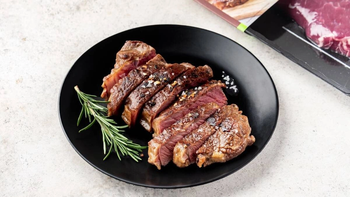 - Стриплойн и другие стейки с жировыми прослойками готовят в среднем по 3 минуты с каждой стороны, так как жир нагревается быстрее и сам начинает «готовить» мясо, которое окружает. На фото ниже — стейк стриплойн из ВкусВилла.