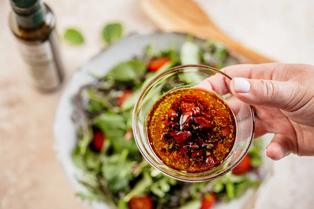 - Мелко нарежьте вяленые томаты, добавьте в соус вместе с орегано и солью. Заправка готова.