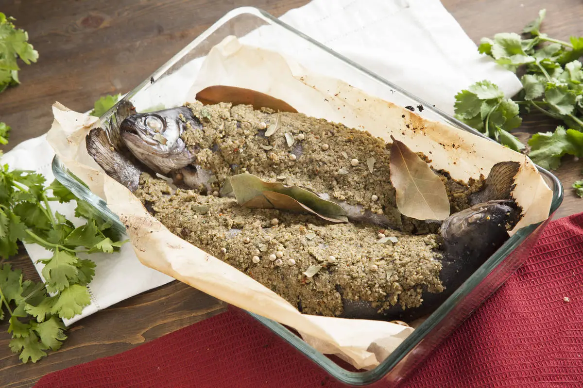 - Получившейся пастой щедро намажьте форель со всех сторон, вложите немного в брюшко. Выложите рыбу в форму для выпечки на пергамент, посыпьте сверху целыми горошинами перца, добавьте 2-3 лавровых листа.