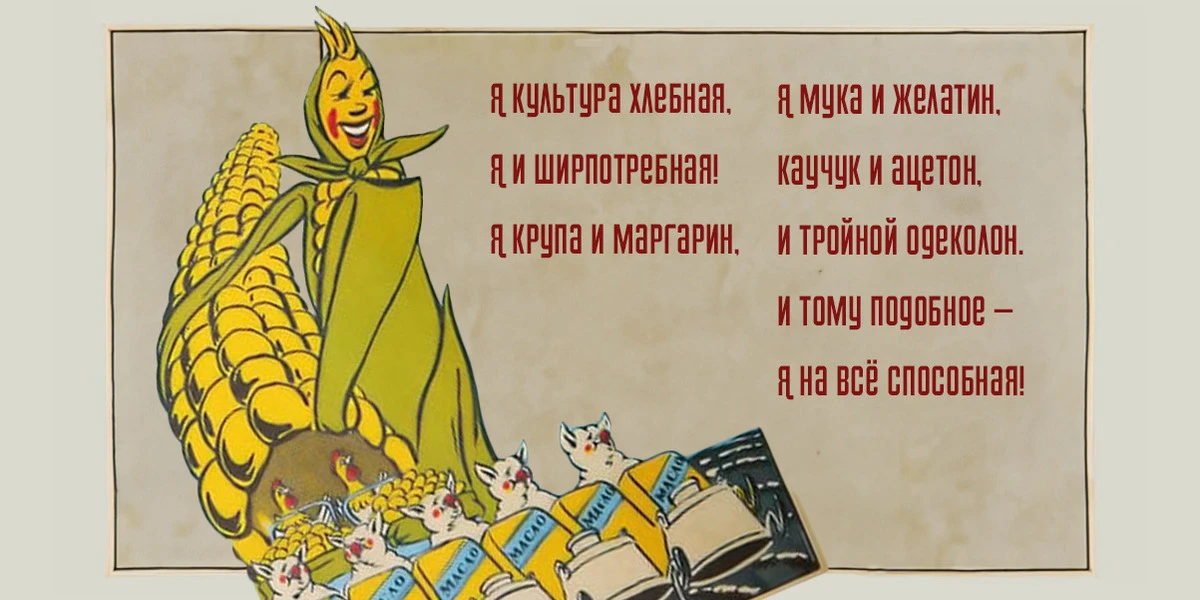 Попытки побороть дефицит продовольствия в середине XX века привели к появлению в официальном нарративе «мема» о кукурузе. Кукуруза, она же царица полей, она же мясо, она же сало, она же молоко, она же — героиня мультфильма для взрослых и детей «Чудесница» и песни Егора Летова. Про кукурузу по заказу чиновников были написаны сотни стихов и песен.