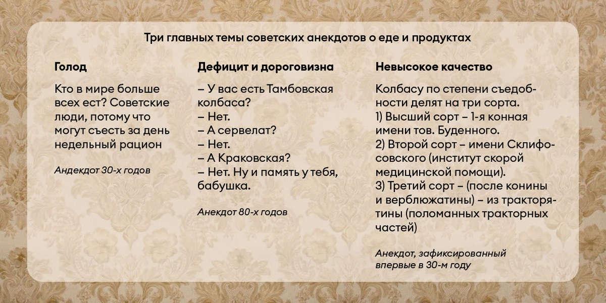 — C 1918 года появляется довольно много анекдотов о голоде, вызванном революцией, гражданской войной и правлением большевиков. Чем острее была эта проблема в СССР, тем больше люди об этом шутили. Ведь авторы анекдотов — народ, который в основном реагирует на новости.