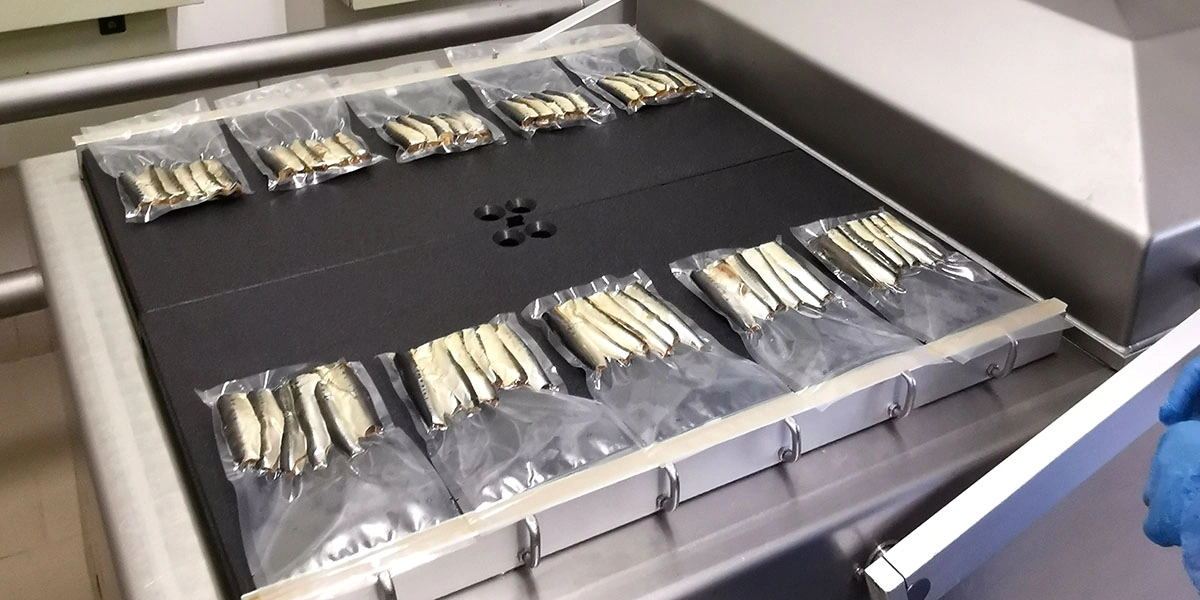 Охлаждённые пресервы фасуют в вакуумные пакеты. Тушки укладывают вертикально, брюшками внутрь, вакуумируют и проверяют герметичность шва.