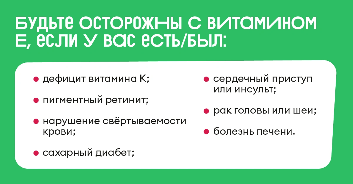 Также необходимо проконсультироваться с врачом, прежде чем начинать пероральный приём витамина Е, если у вас есть/был: