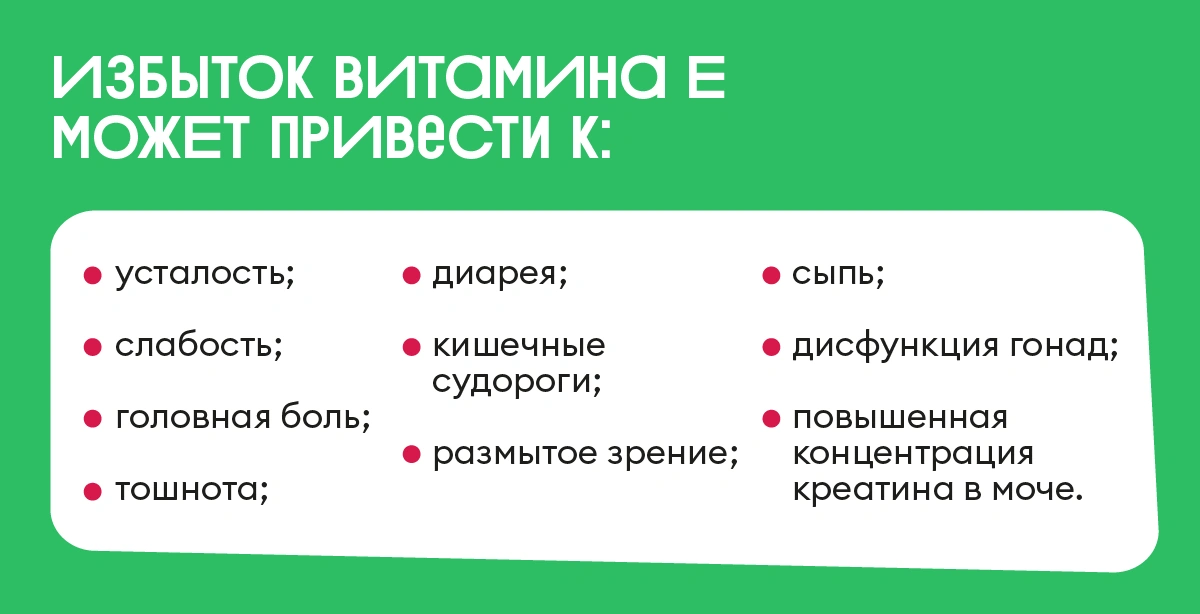 Существует несколько побочных эффектов, которые редко, но всё-таки могут возникнуть в определённых случаях при избыточном пероральном употреблении витамина Е: