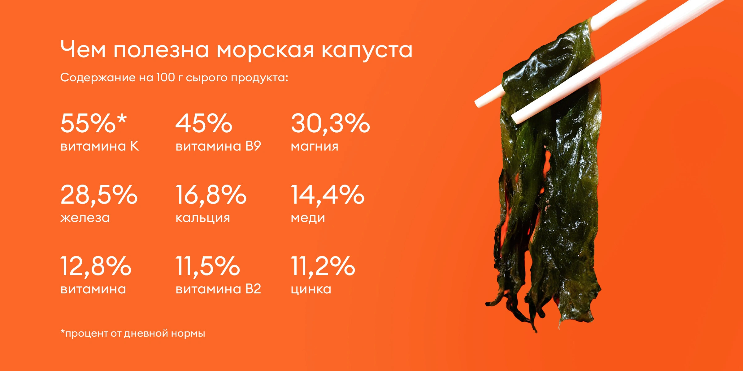 В среднем морская капуста содержит около 300 мкг йода на 100 г продукта. Это в два раза больше рекомендуемой дневной нормы для взрослого человека.