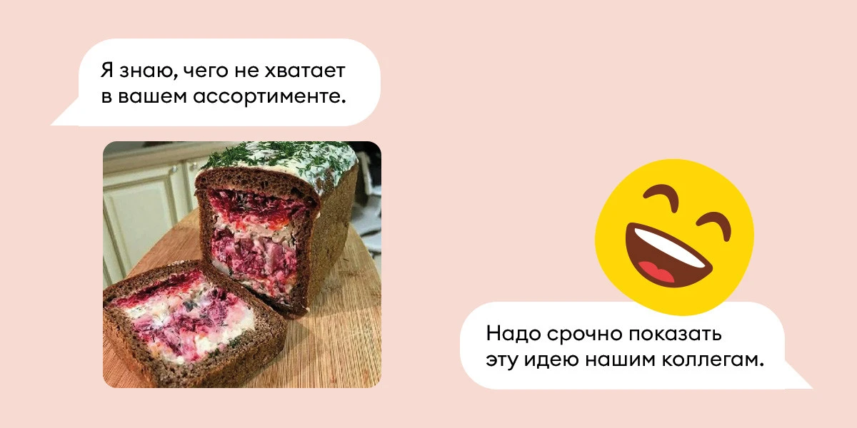 И раз уж мы заговорили про крабовые палочки, не можем промолчать про историю, которая случилась под Новый год. Покупатель написал в одной из соцсетей (то ли в шутку, то ли всерьёз), что нам в ассортименте не хватает… селёдки под шубой в буханке ржаного хлеба. Мы приняли вызов и обратились к поставщикам готовых салатов.