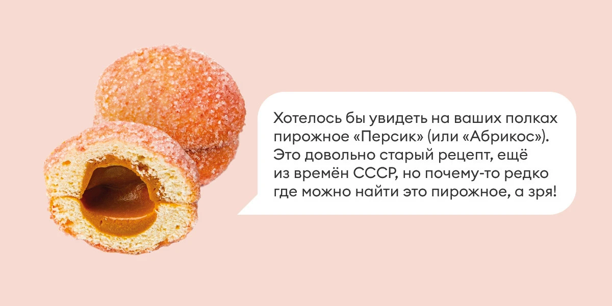 «Здравствуйте, просто пожелание на будущее: хотелось бы увидеть на ваших полках (когда-нибудь) пирожное под названием «Персик» (или «Абрикос»). Это довольно старый рецепт, ещё из времён СССР, но почему-то редко где можно найти это пирожное, а зря!» — написал нам покупатель.