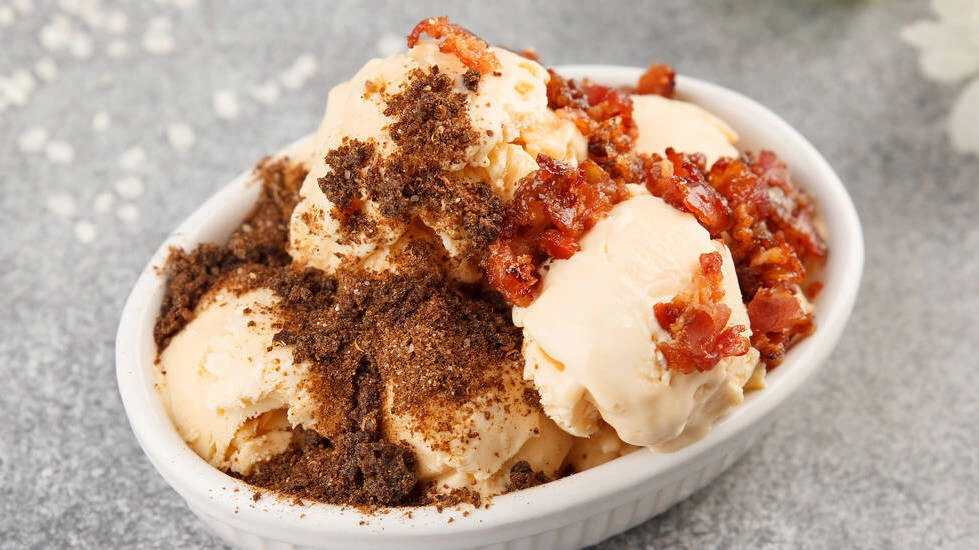 Изюминка рецепта — солёный топпинг на основе сырокопчёного бекона или бородинского хлеба. Подробный рецепт смотрите здесь.