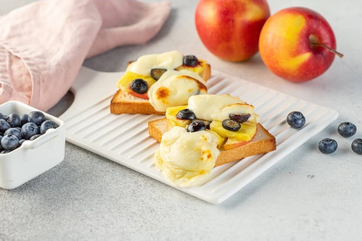 - Яблоко и ананас нарежьте тонкими ломтиками, положите на тосты, добавьте ягоды голубики. Сверху положите кусочки сыра.