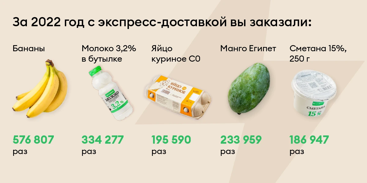 Выяснили, что лидерами в экспресс-доставке являются бананы. За ними ожидаемо следуют молоко, яйца, сметана. А предпоследнее место в пятёрке лидеров занял наш любимчик — чего уж скрывать! — манго Египет.