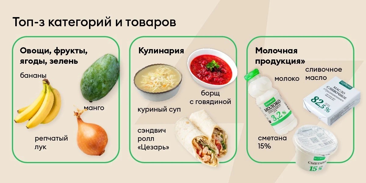 Если смотреть масштабнее, по категориям, то на первом месте оказались «Овощи, фрукты, ягоды, зелень», на втором — «Кулинария» (знаем, что вы любите куриный суп, борщ с говядиной и сэндвич-роллы «Цезарь»), а третьей по популярности стала категория «Молоко и молочная продукция».