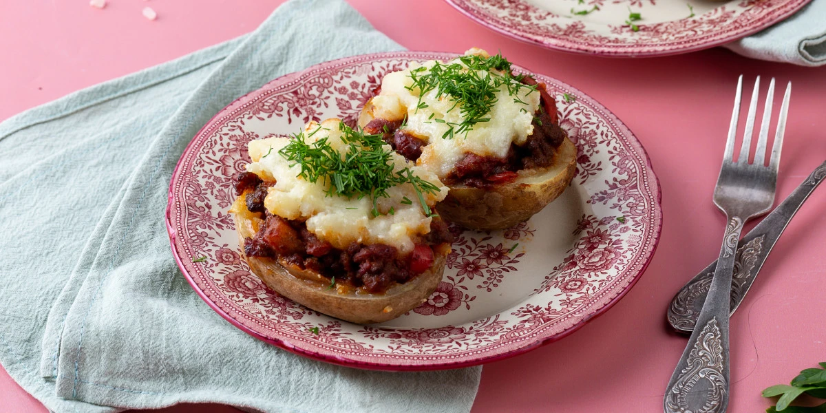 - Начините лодочки из картофеля фаршем с фасолью и овощами. Сверху выложите картофель с сыром.