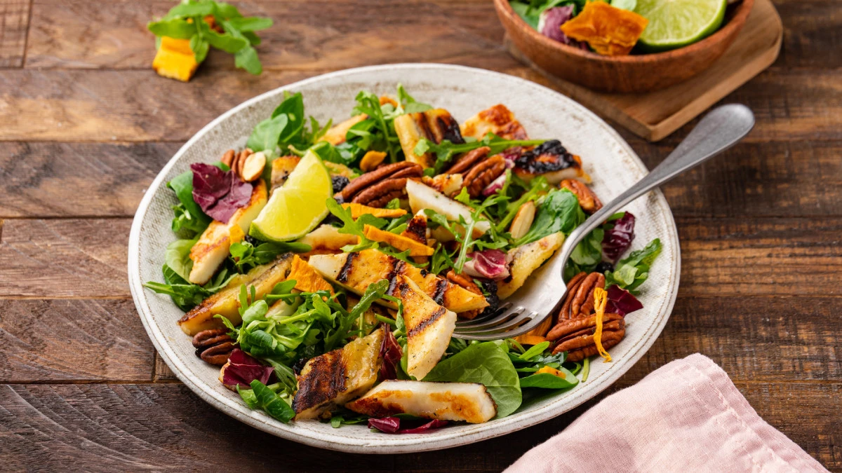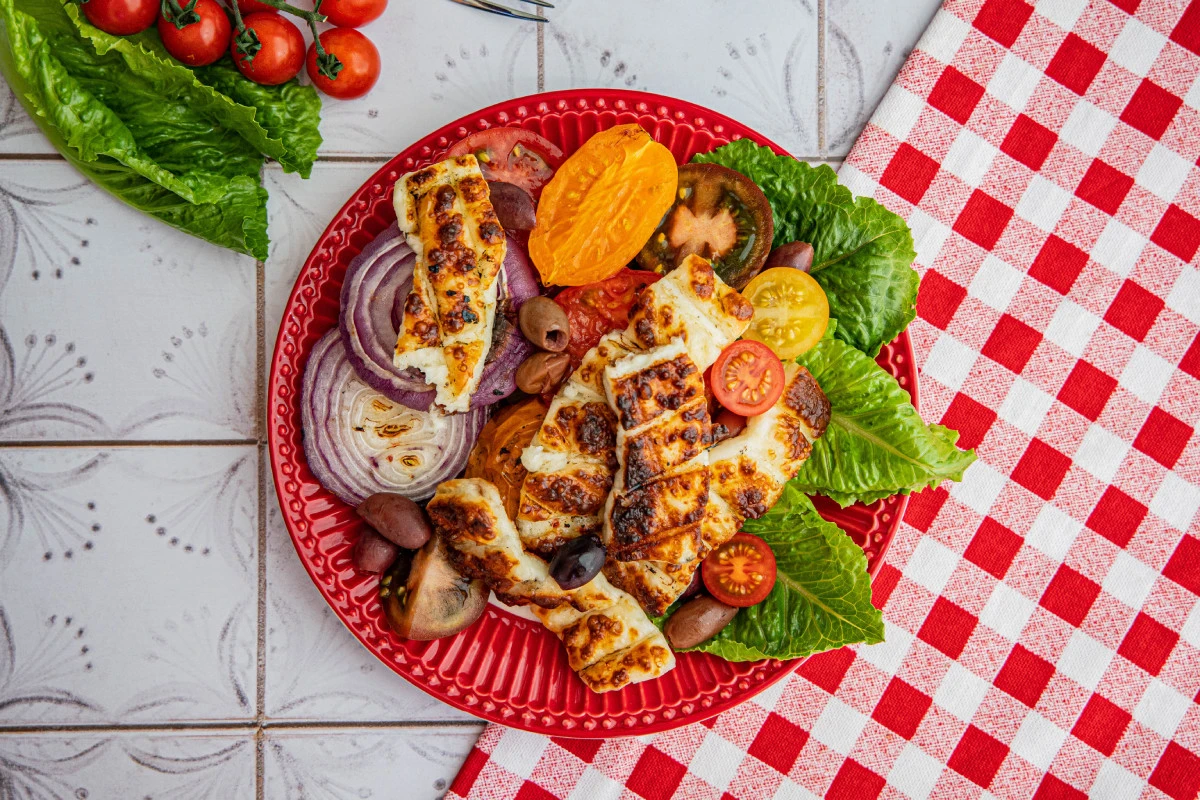 Жареным на сковороде халумисом уже никого не удивить, пора пробовать жарить сыр на мангале. Халумис прекрасно жарится над углями, получается с хрустящей румяной корочкой и пахнет дымком. Добавьте к нему подпечённых овощей и наслаждайтесь гриль-салатом.