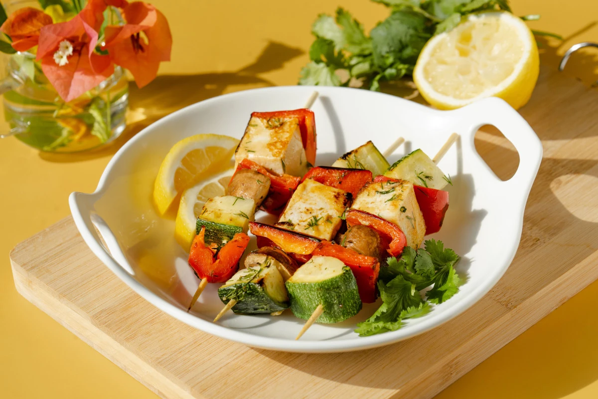 - Нанижите овощи и тофу на деревянные шпажки и жарьте на гриле по 1–2 минуты с каждой стороны. Обязательно предварительно вымочите шпажки в воде, чтобы они не подгорали.