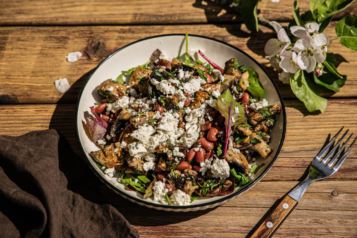 - Заправьте грибы и фасоль оливковым маслом, посолите и перемешайте.