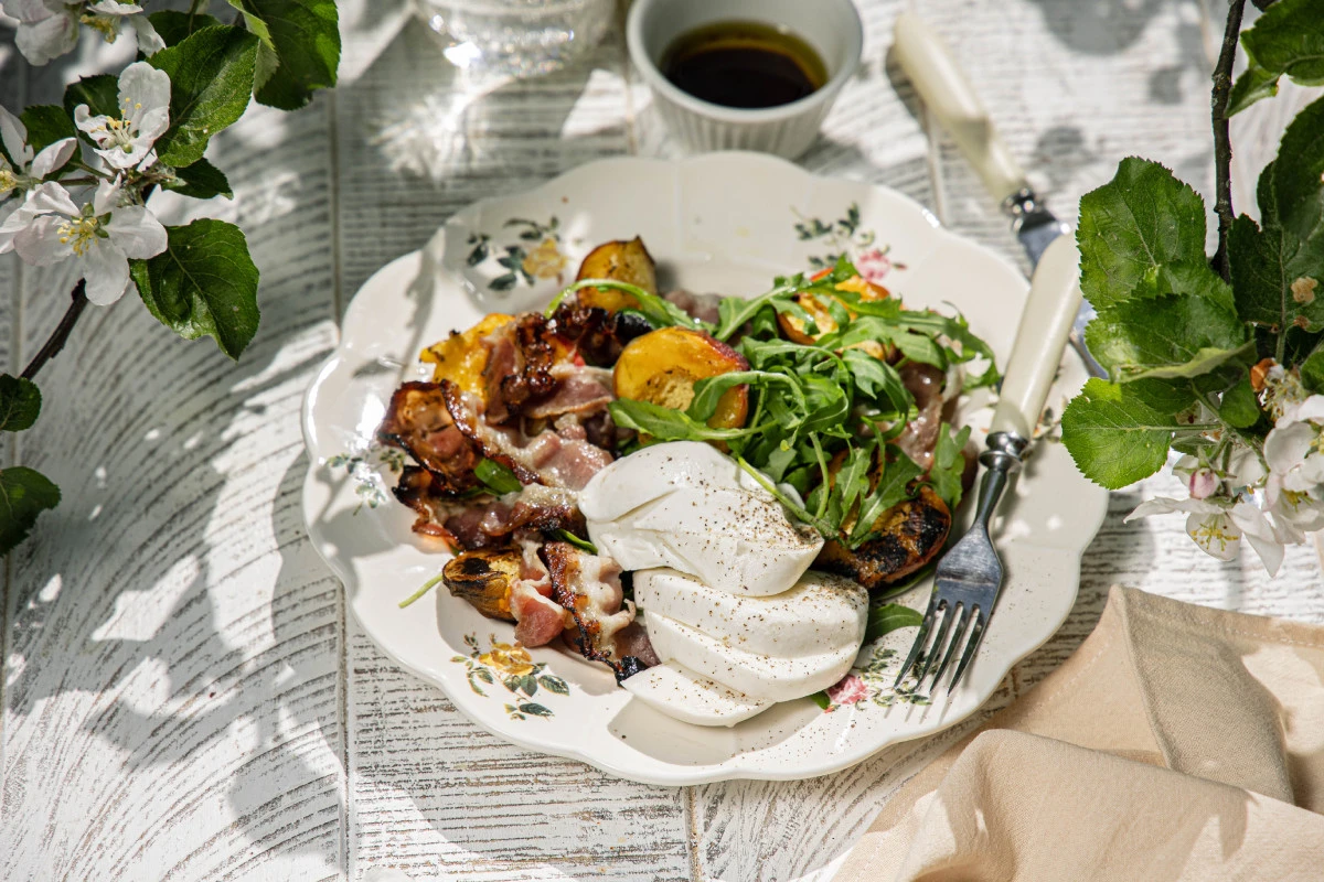 - В салатник выложите руколу, добавьте нарезанную моцареллу, печёные персики и бекон.