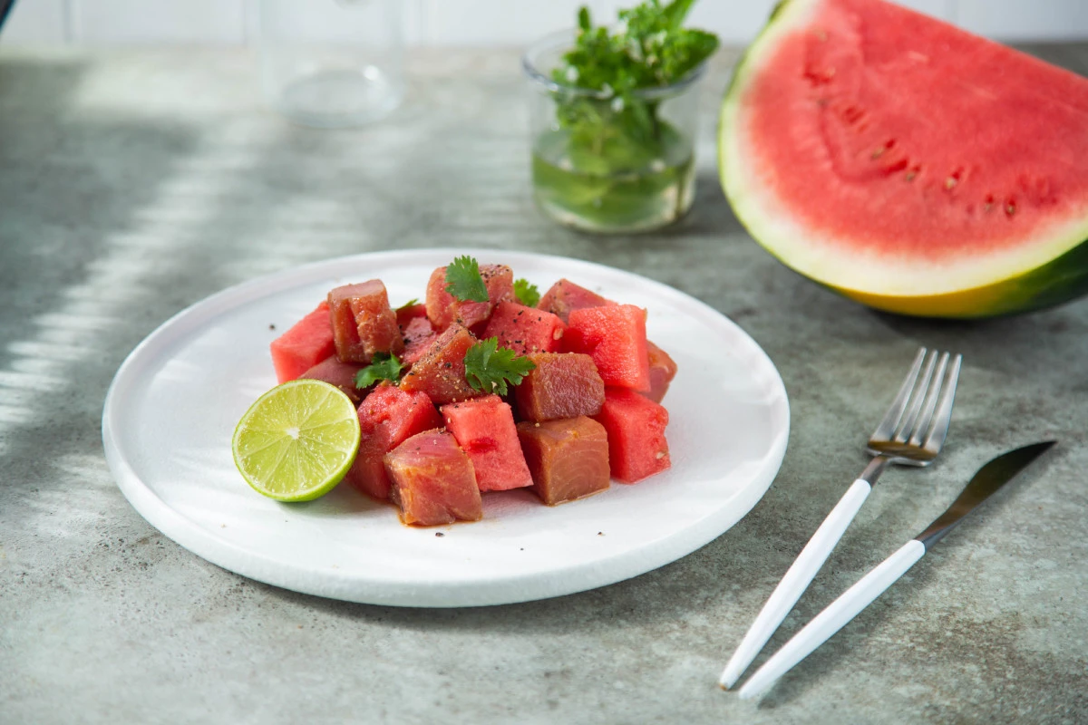 Очень вкусная и необычная закуска к любому летнему празднику или просто так. Не стоит бояться сырого тунца, так как он был глубоко проморожен, а затем замаринован в лаймовом соке. Зато сочетание сочного арбуза и нежного тунца — просто фантастическое, это очень-очень вкусно.