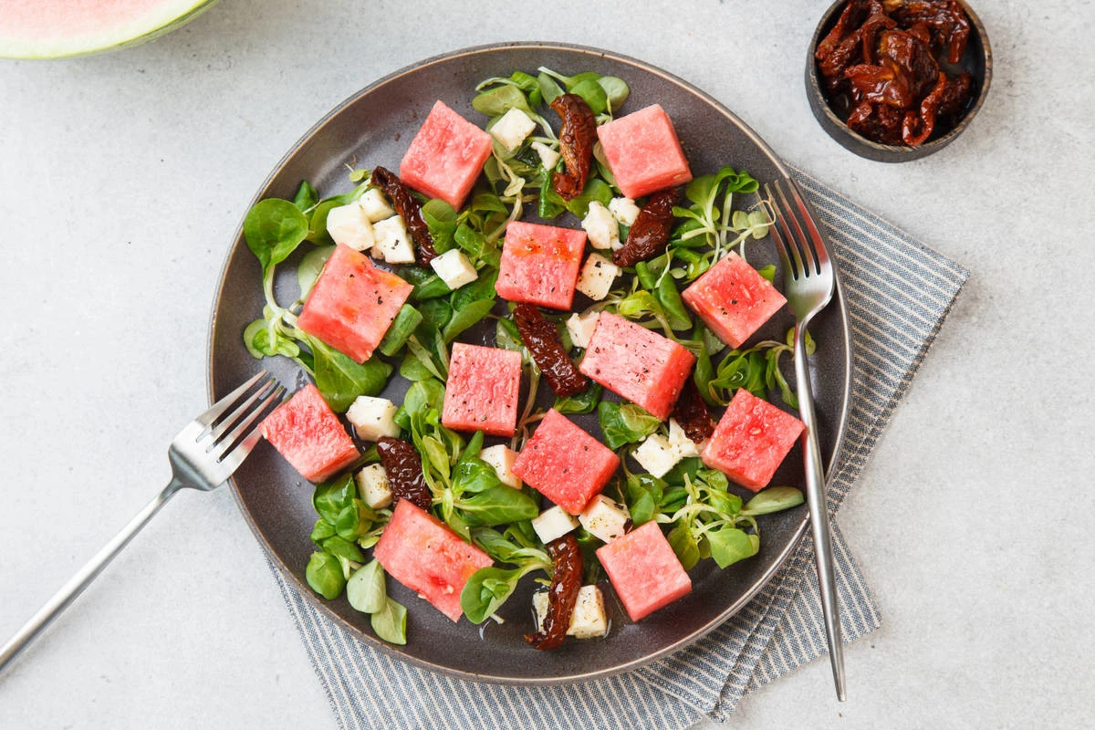 Арбуз с фетой наверняка уже многие пробовали. А как насчёт того, чтобы добавить вяленые томаты? Неожиданно вкусное и свежее сочетание.