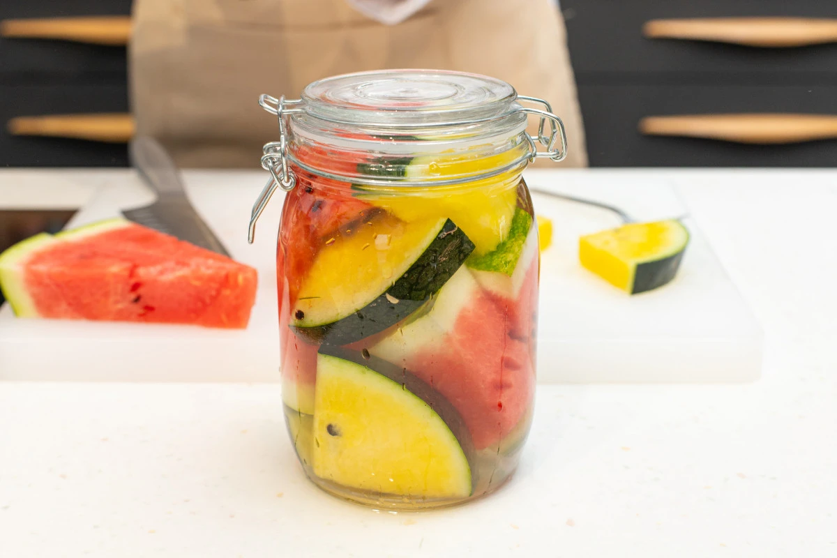 - Залейте полученным маринадом арбузы, закройте банки и оставьте в тёплом месте мариноваться на сутки. Затем храните в холодильнике.