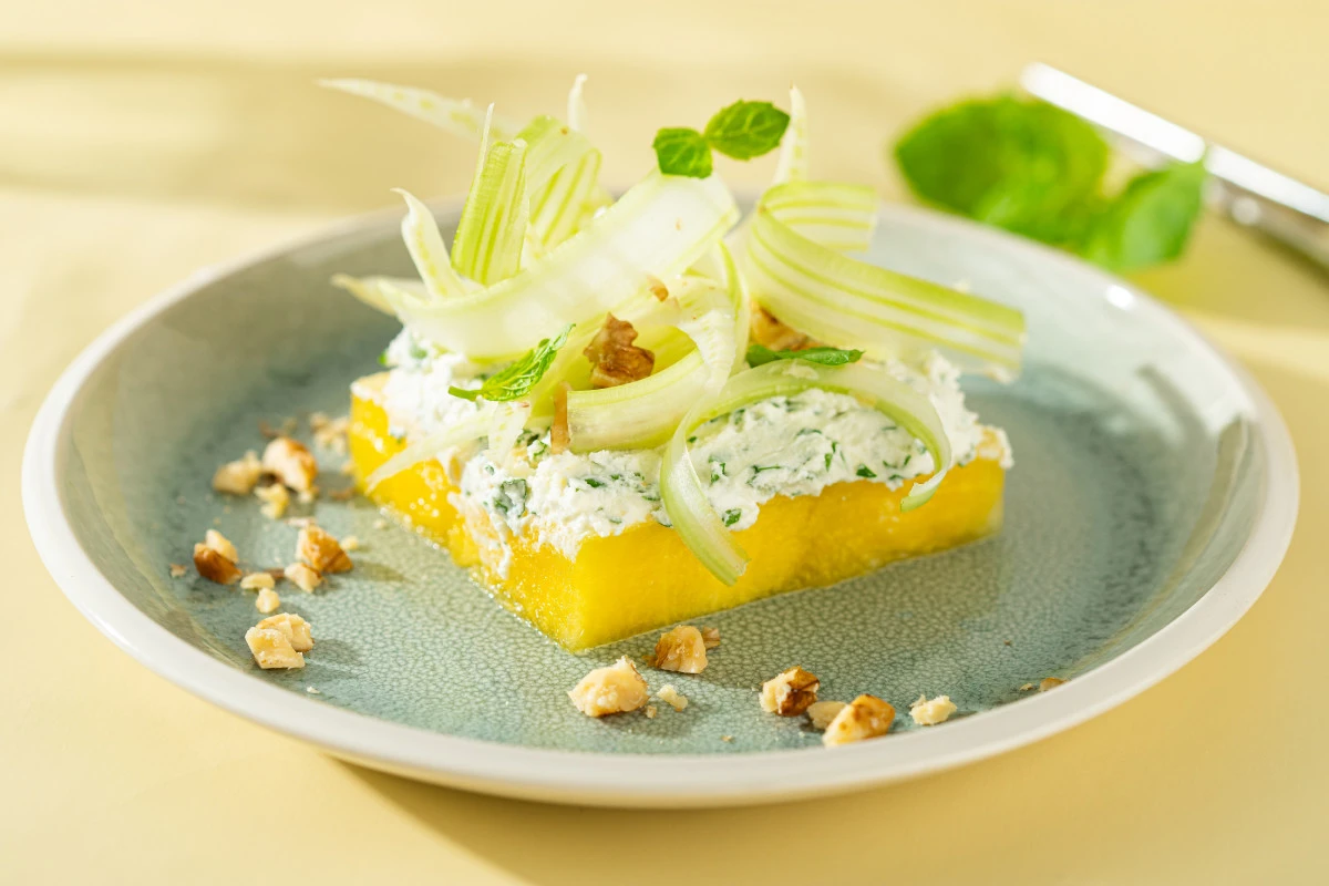 - Выложите на каждый ломтик арбуза по половине сыра с зеленью, разровняйте. Сверху положите слайсы сельдерея и фенхеля. Посыпьте грецкими орехами, украсьте листиками мяты и подавайте.