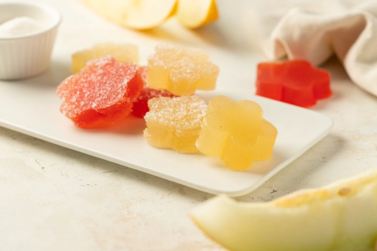- Разлейте получившуюся массу по формочкам (можно использовать формы для печенья, льда или обычную форму для выпечки) и поставьте в холодильник до застывания (20–30 минут). Застывший мармелад выньте из форм или разрежьте на кусочки, если заливали большую цельную форму, и обваляйте в сахаре.