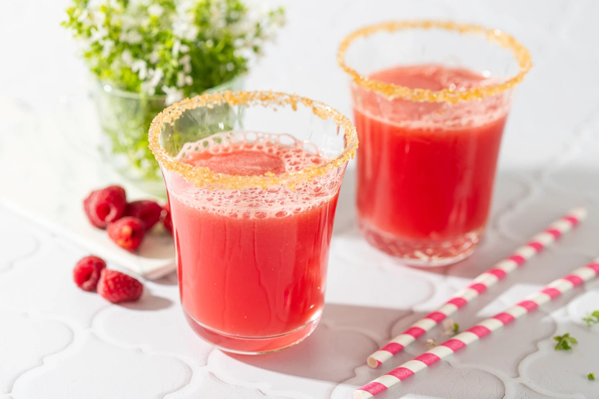 - Смешайте измельчённый с водой арбуз и измельчённый с малиной и мятой арбуз, добавьте сок лайма по вкусу, перемешайте. Аккуратно разлейте по стаканам с сахарными ободками и подавайте аквафреску охлаждённой или со льдом.
