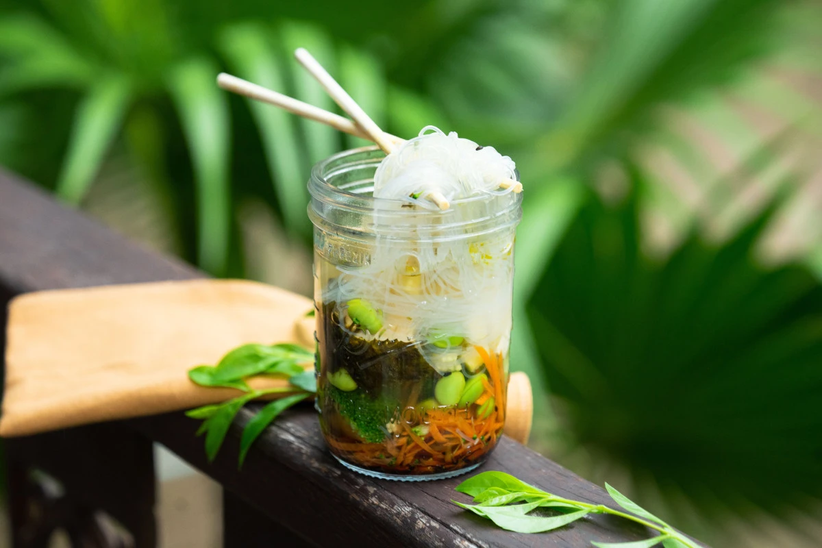 Такую баночку с фунчозой и овощами можно взять с собой на работу или учёбу либо убрать в холодильник и доделать позже. Для этого просто залейте всё кипятком так, чтобы вода покрывала лапшу, через минуту блюдо будет готово. Перемешайте ингредиенты и соусы внутри баночки — и приятного аппетита.