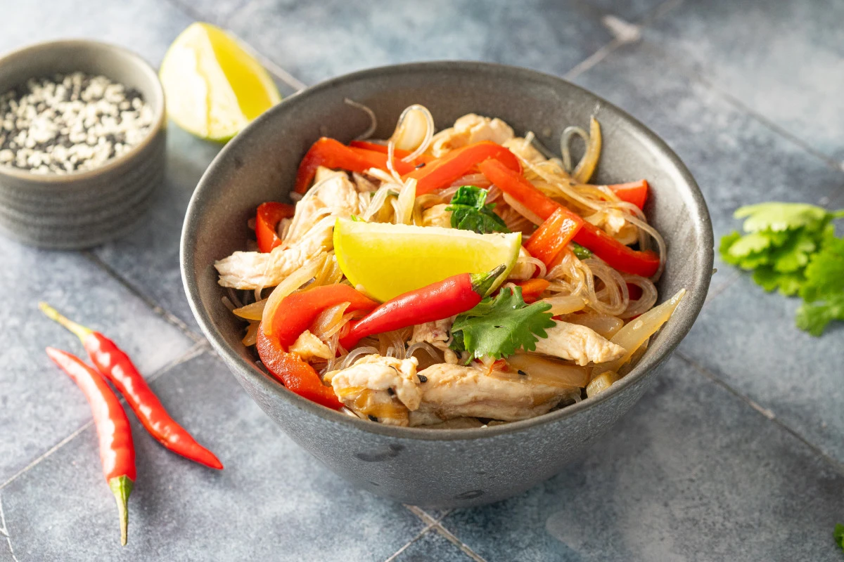 - Фунчозу залейте кипятком, оставьте на пару минут до размягчения. Слейте воду или достаньте из неё лапшу щипцами. Кинзу крупно нарежьте. Добавьте фунчозу и кинзу к курице с овощами в сковороду, перемешайте, прогрейте всё вместе, по желанию положите пару колечек острого перца. Если добавляете чили, подавайте блюдо с долькой лайма или полив его соком, чтобы сгладить остроту.