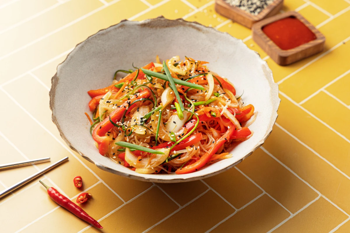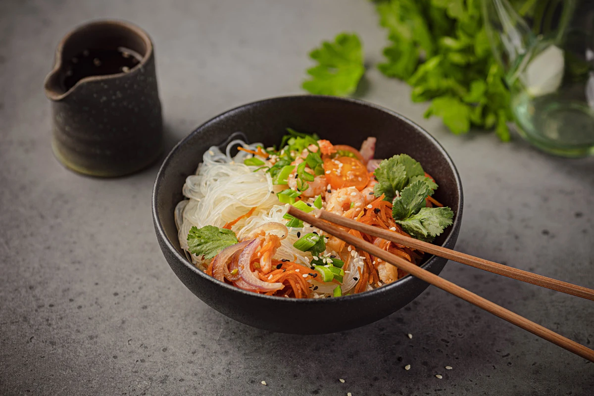 Стеклянная лапша, овощи, немного соуса в азиатском стиле — и у вас на столе вкусный и лёгкий салат, который подойдёт и для повседневного ужина, и на праздник.
