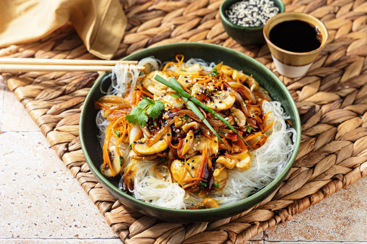 - Разложите фунчозу по тарелкам, сверху — грибы с овощами. Посыпьте кунжутом и добавьте ещё немного терияки при подаче. Украсьте перышком зелёного лука и листиком кинзы.