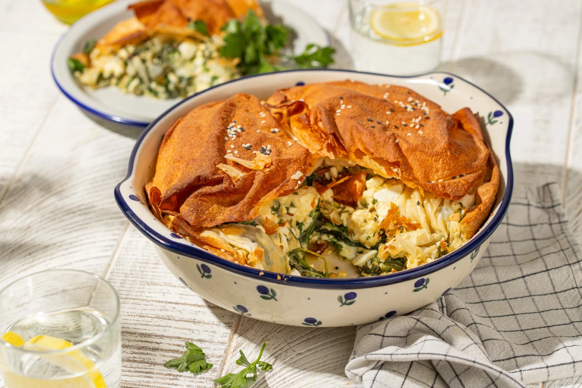 Это несладкий греческий пирог из теста фило, для начинки которого используется шпинат, фета, лук и яйцо. Выпекается он в большой форме, а затем нарезается порционно.