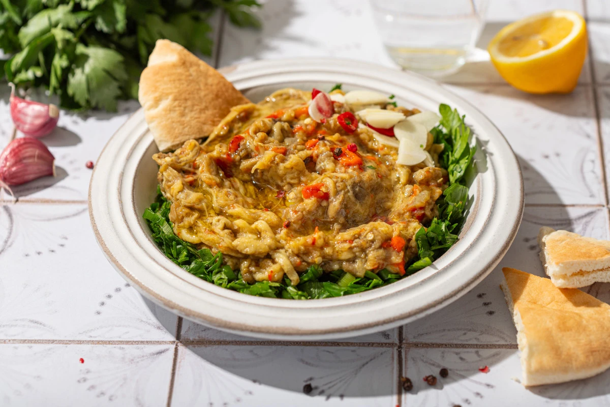 - Выложите зелень на тарелку, сверху поместите печёные баклажаны и перец, посолите и поперчите. Добавьте чеснок и острый перец, заправьте уксусом и оливковым маслом.