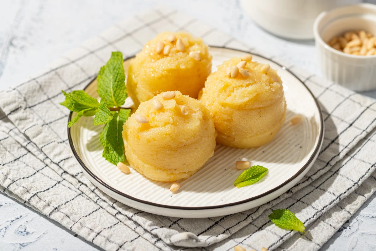 - Скатайте шарики из остывшей массы. Выложите на тарелки, украсьте кедровыми орешками и мятой.