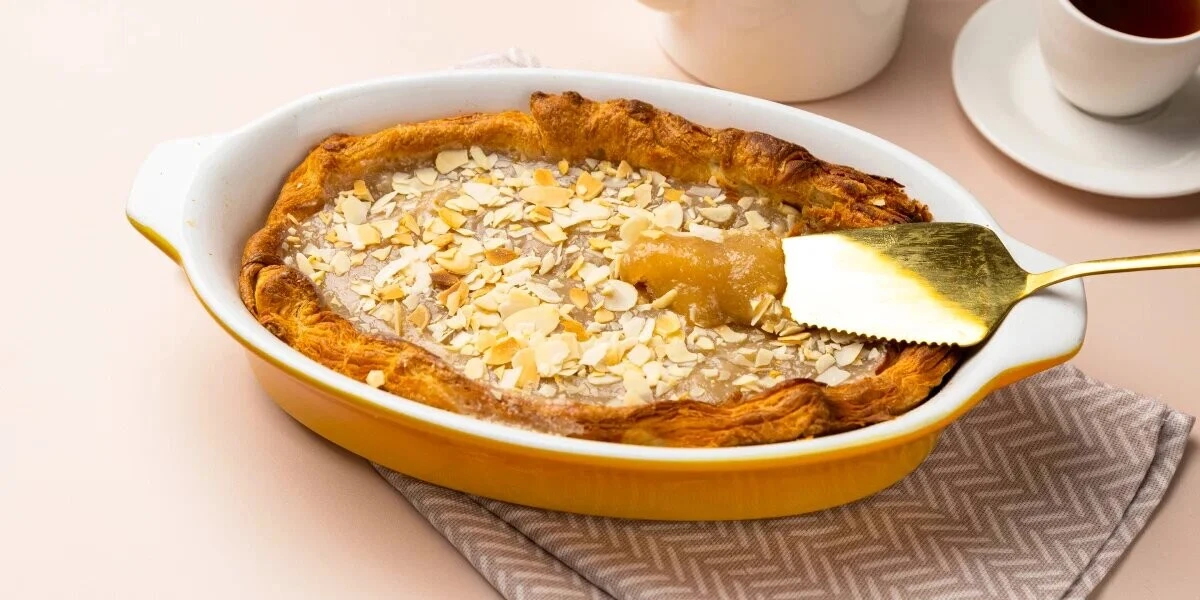 Мы переосмыслили наш хит — миндальный круассан. И приготовили его в виде… пирога. Делается он довольно просто, по вкусу максимально близок к оригиналу. Кажется, этот рецепт войдёт в топ, как и сам миндальный круассан из ВкусВилла.
