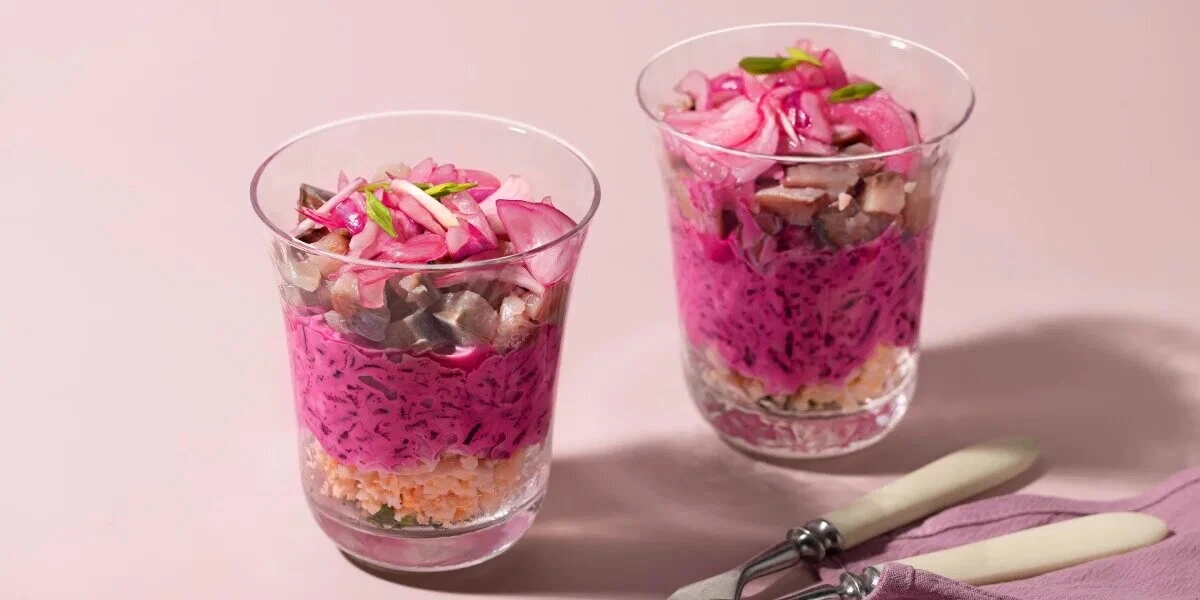 В разделе рецептов нашего Медиа вариаций селёдки под шубой множество. А вот селёдки над шубой нет ни одной — и мы решили это исправить. Подавать салат лучше как порционный, так красивее.