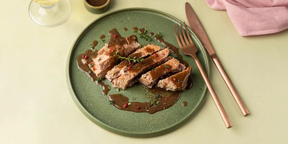 - Готового тунца порежьте ломтиками, разложите по тарелкам и полейте мясным соусом.