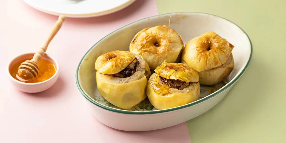 - Нафаршируйте яблоки уткой, выложите в форму для запекания и верните в разогретую до 200 ℃ духовку на 15–20 минут. Яблоки должны стать мягкими, но сохранить форму.