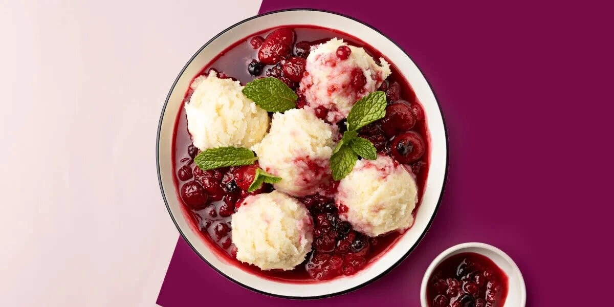 - Остудите манку и ягодный соус. Из манки сформируйте шарики, выложите в тарелку и залейте ягодным соусом. Украсьте мятой и подавайте!