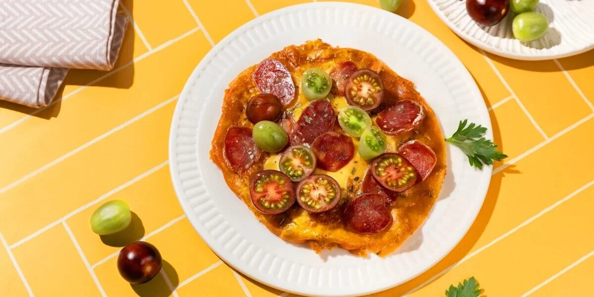 - Сверху выложите тортилью и ещё сыр, переверните. Выложите сверху кусочки колбасы и черри, посыпьте орегано. Снимите «пиццу» со сковородки и сразу подавайте.