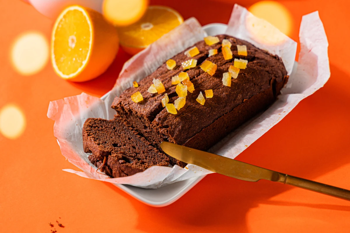 - Готовый кекс украсьте нарезанными апельсиновыми цукатами. Можно перед этим полить растопленным шоколадом.