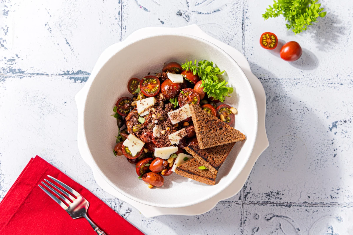 - Измельчите на мелкой тёрке шоколад и посыпьте им салат. Украсьте ломтиками подсушенного хлеба, базиликом и подавайте.