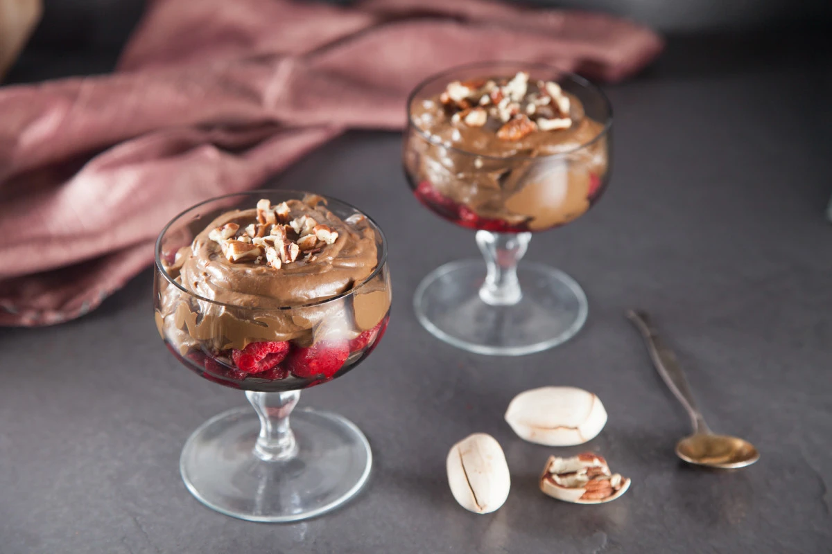 - В креманки выложите ягоды малины, сверху — шоколадный мусс. Украсьте измельчёнными орешками. Подавайте охлаждённым.