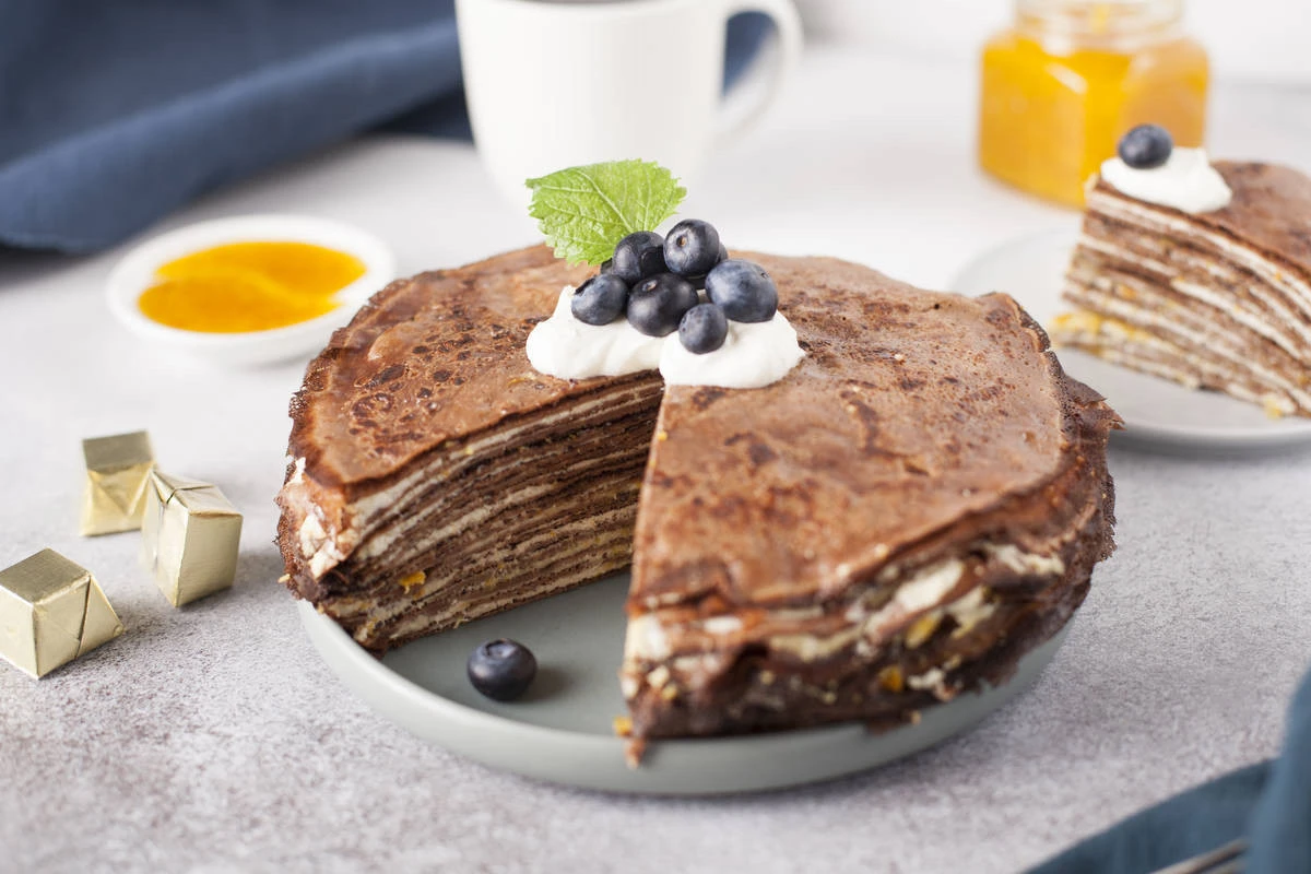 Здесь есть маленький секрет: чем больше слоёв, тем сытнее готовое блюдо. В нашем рецепте оттеняет шоколадный вкус мандариновое варенье, но если вы хотите ягодную начинку — отлично подойдут замороженные или свежие.