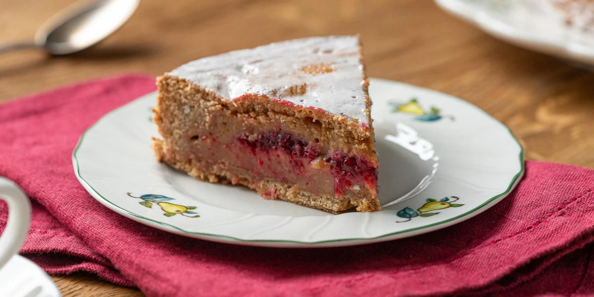 10. Отрежьте половину теста. Выложите в форму для выпекания, распределите по дну, сформируйте бортики. Выложите бруснику без жидкости, сверху — оставшуюся половину теста, залепите края.