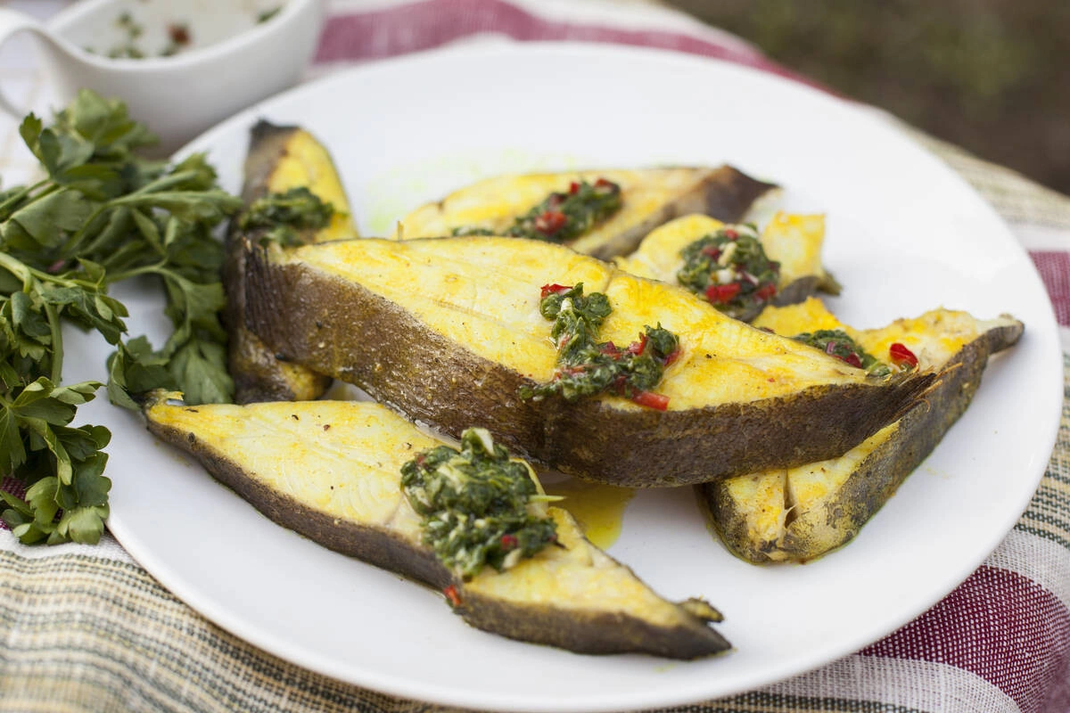 Рецепт 5: палтус на мангале с зелёным соусом