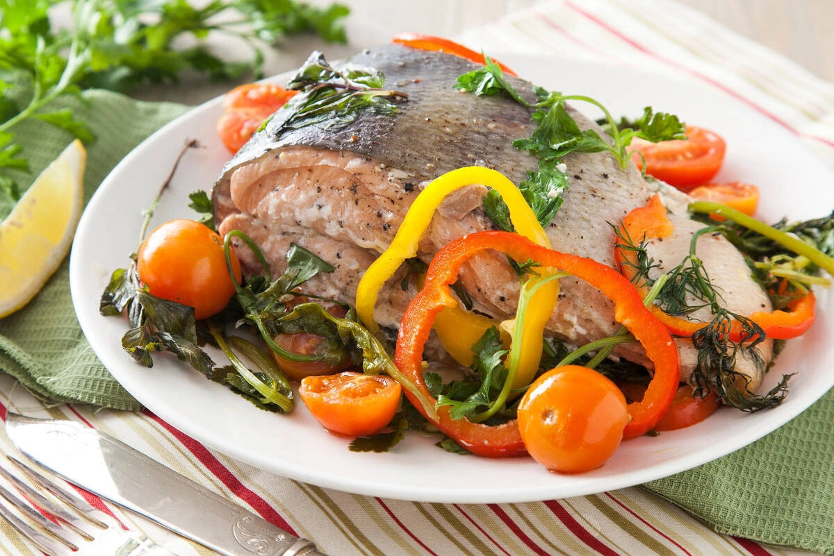 На фото: кета с травами и овощами в фольге. Подробный рецепт смотрите здесь.