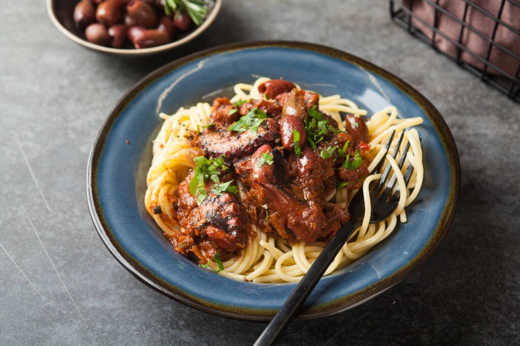 - Обжарьте сельдерей, лук и кубики морковки на оливковом масле, добавьте банку резаных томатов и щупальце, порезанное на кусочки. Вино и пряные травы тоже не помешают. Тушите около часа. В конце добавьте оливки.