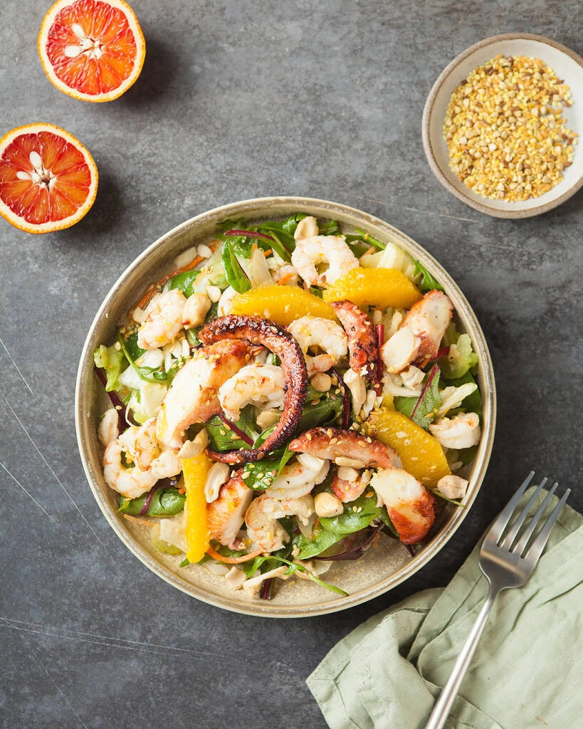 Конечно, роскошное мясо осьминога так и просится в салат. Например, с сельдереем, фенхелем, апельсинами, салатными листьями. Добавьте ещё и креветки – праздник, а не блюдо! Ну и, конечно, в любые салаты, куда вы добавили бы кальмаров или креветки, осьминог тоже прекрасно впишется.