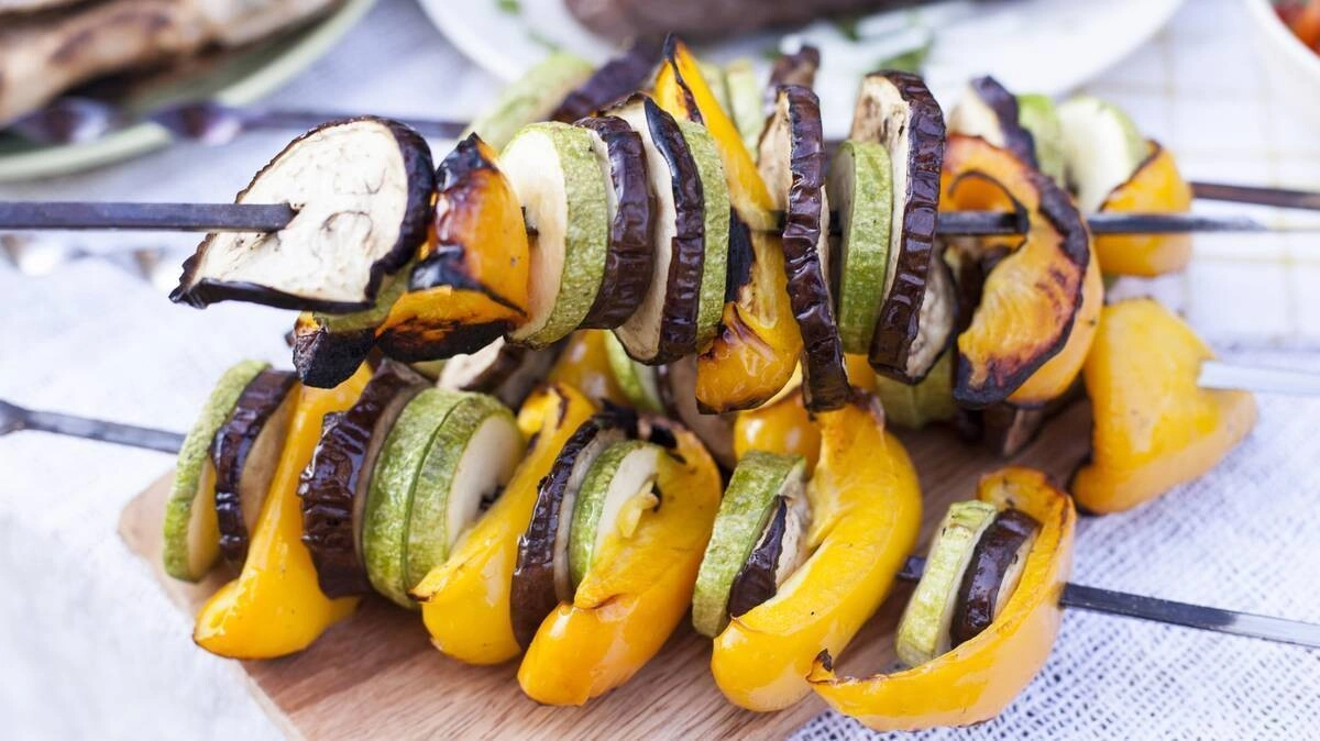 3. Нанижите овощи на шампуры и жарьте над углями до готовности.