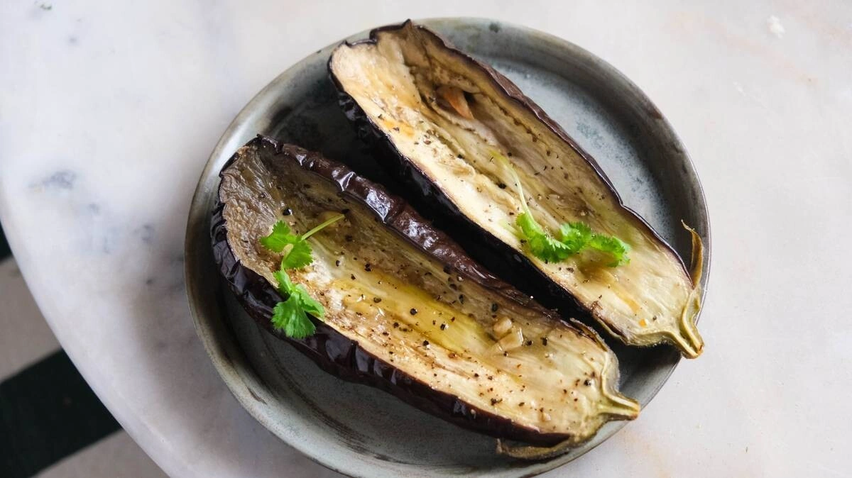 3. Смажьте баклажаны маслом, поперчите и заверните в фольгу. Запеките на решетке 15 минут – до размягчения.